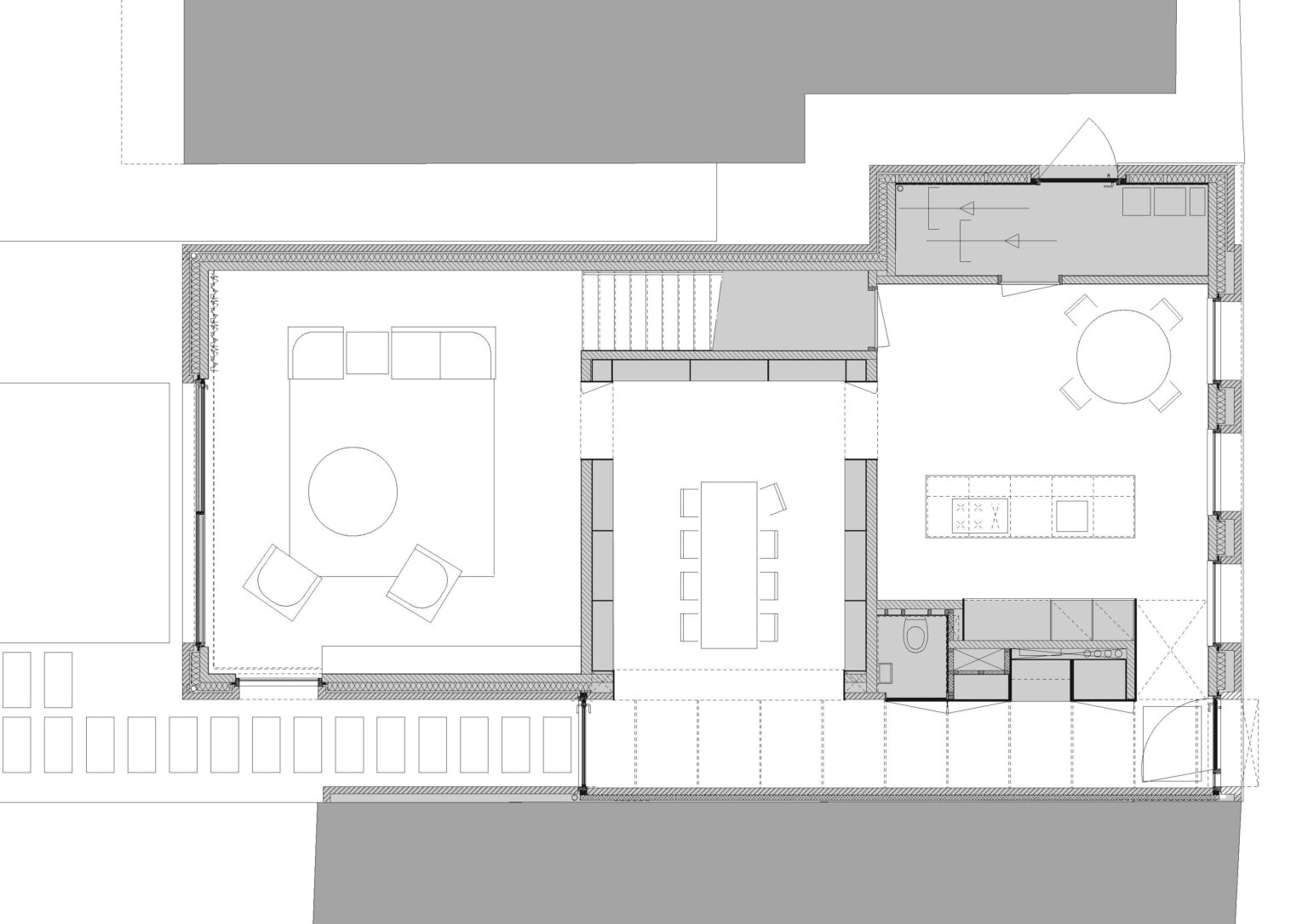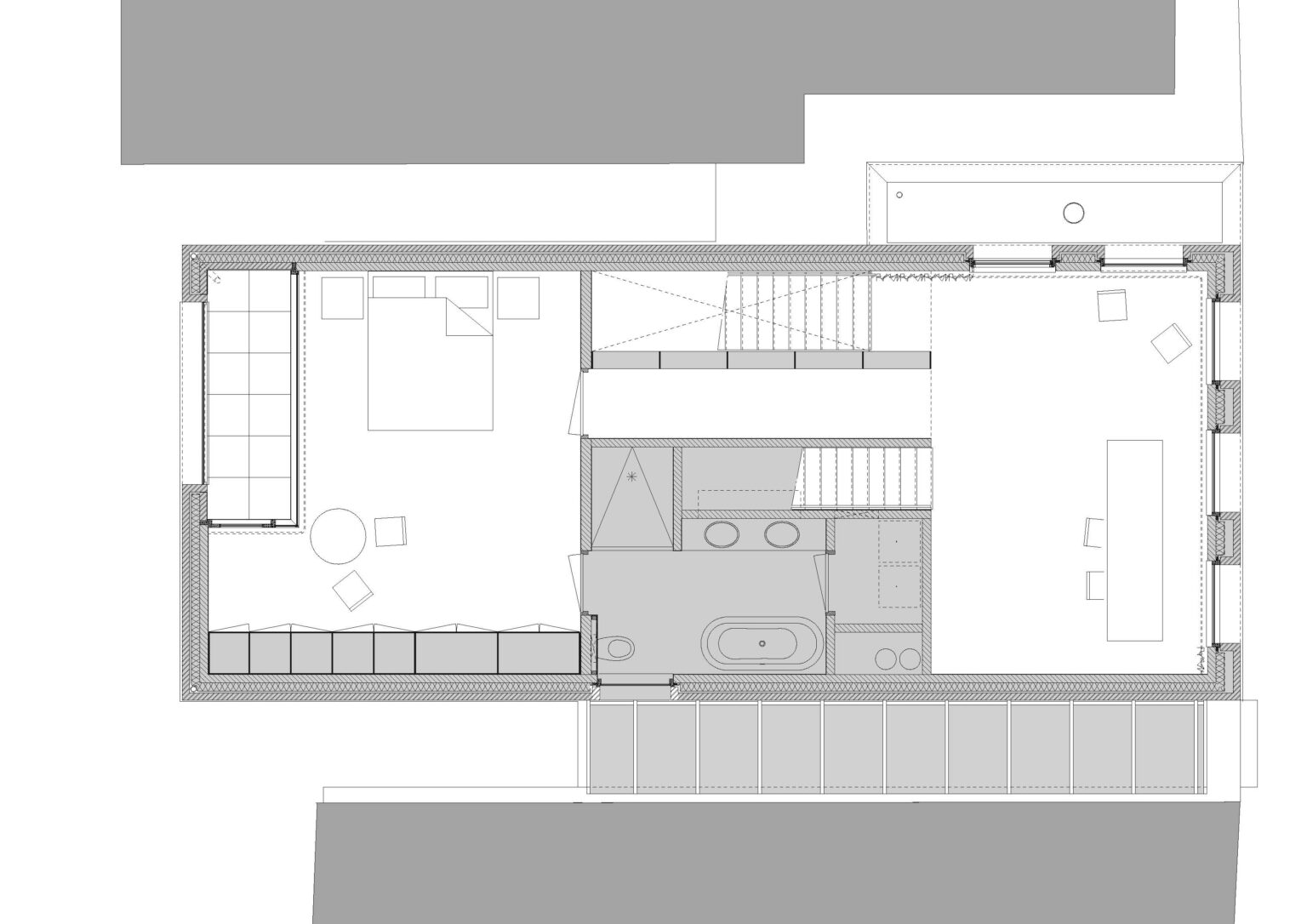 Het bakhuis, ofwel ’t hûske, is aangepast om een slaapkamer op de begane grond te realiseren. Deze uitbreiding vergroot het bestaande oppervlak en is ontworpen met het uitzicht vanuit de woning als uitgangspunt. Hierdoor ontstaat een lange muur langs het oprijpad, die tevens als barrière fungeert. Deze muur wordt enkel onderbroken door de entree.