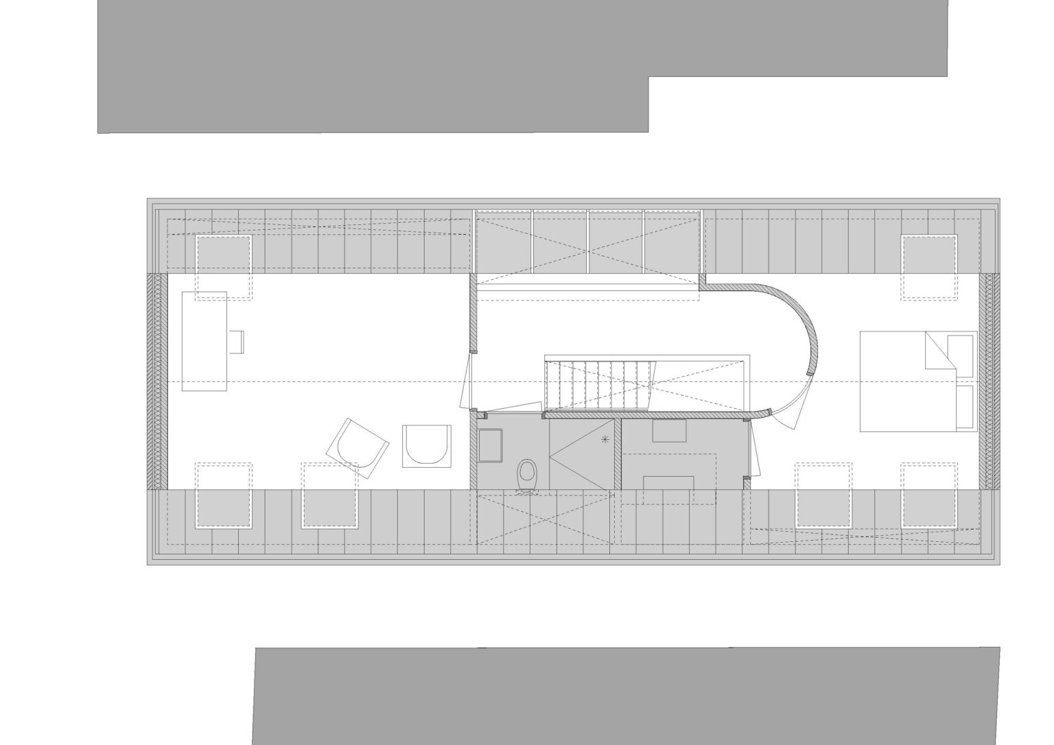 De stal heeft, door de lagere verdiepingshoogte en bakstenen plafonds, een geheel andere sfeer dan het woonhuis, dat wordt gekenmerkt door relatief hoge plafonds. Dit contrast komt tot uitdrukking in het nieuwe ontwerp, waarin vier verblijfsruimten rondom een centrale kern zijn gecreëerd. De positie van deze kern is bepaald door de bestaande brandmuur, waardoor vier kamers met elk eigen afmetingen en functies ontstaan.