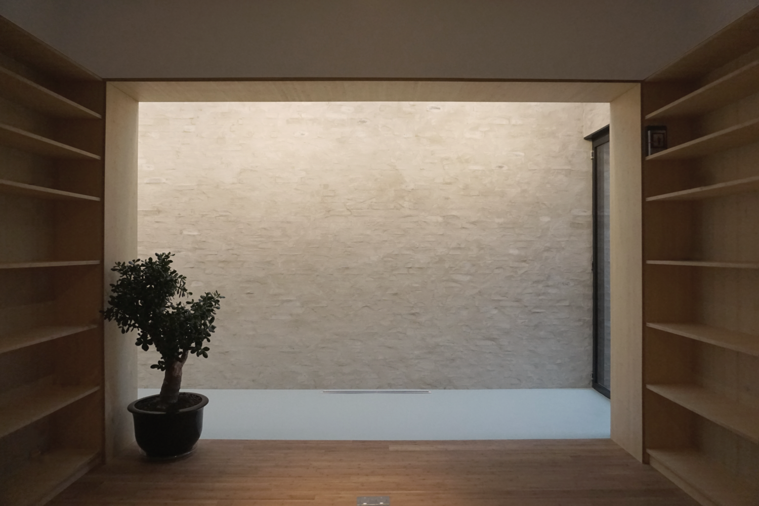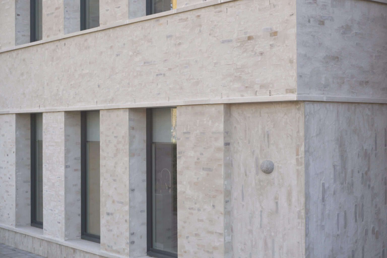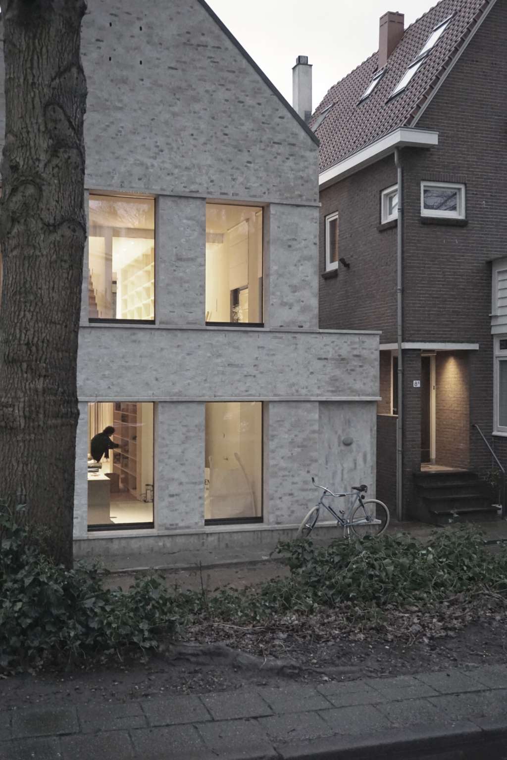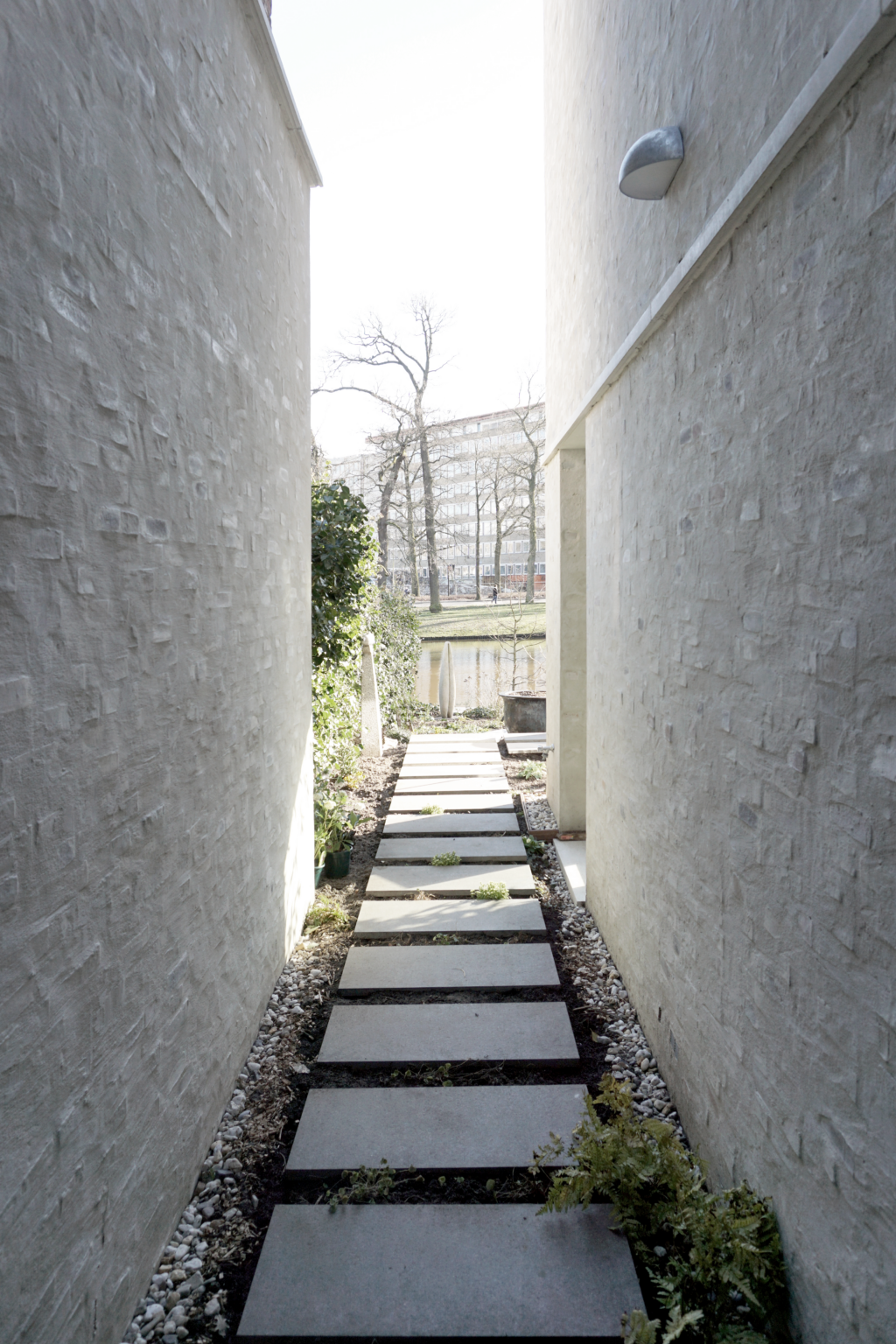 De entree, met daarachter een licht oplopende gang naar het hoofdvolume, is zowel binnen als buiten voorzien van een afwijkende materialisatie, wat zorgt voor een subtiele, maar duidelijke overgang.